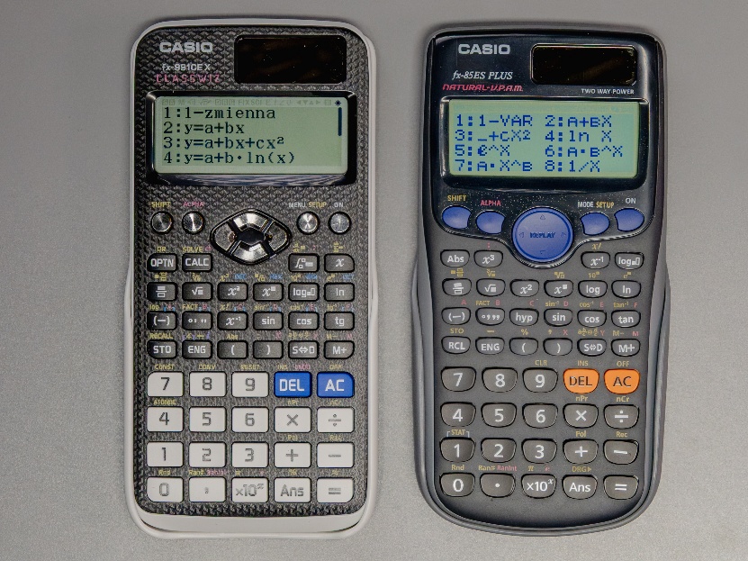 Nowszy model po wyborze obliczeń dla jednej zmiennej wyświetli wszystkie wartości. W modelu starszym wartości dostępne są pod trzema przyciskami. Oddzielnie wyświetla SUM (sumę danych), MinMax (minimalną i maksymalną wartość wśród danych) oraz VAR, gdzie znajdują się najciekawsze dla nas wartości: liczba pomiarów n, średnia arytmetyczna 𝑥̅, odchylenie standardowe próby Sx, odchylenie standardowe populacji σx.