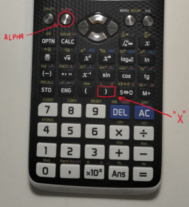 Pojawi się wtedy napis „f(x)=” i migający kursor. Możemy wtedy wpisać postać naszej funkcji, która pozwala obliczać wartości poszczególnych komórek tabeli. Zazwyczaj w arkuszu jest to funkcja jednej zmiennej i na takiej się skupimy. Do wprowadzenia zmiennej x służy przycisk ALPHA + ). Nad nawiasem widać narysowaną zmienną „x” w kolorze odpowiadającej przyciskowi ALPHA, który jest na lewo u góry.