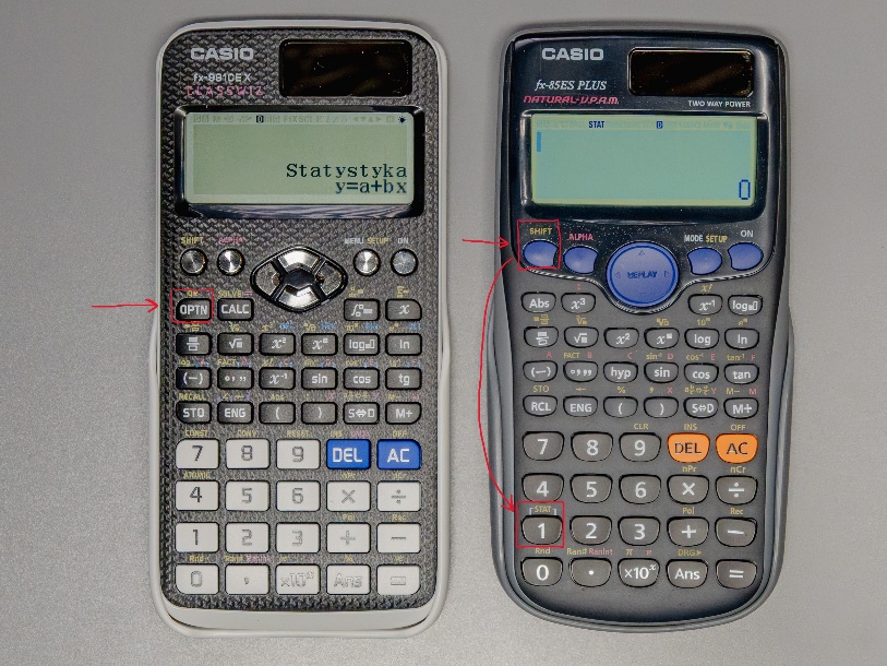 W tym momencie mamy już wszystko przygotowane na odczytanie wartości szukanych współczynników. Przyciskiem AC wychodzimy z ekranu uzupełniania tabeli i wybieramy OPTN w nowych modelach kalkulatora. W starszych modelach wciskamy SHIFT i STAT (nad jedynką).