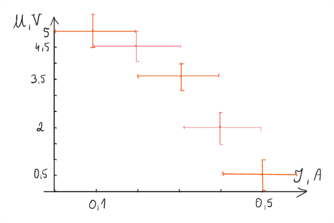 Musimy przygotować układ współrzędnych, gdzie na osi pionowej będzie napięcie, a na poziomej natężenie prądu. Nie znamy zakresu błędów poszczególnych pomiarów. Moglibyśmy jedynie wnioskować po zapisie w tabeli, że błąd napięcia wynosi co najmniej 0,1 V a co najwyżej 0,5 V. W przypadku natężenia sprawa jest prostsza, bo widać dokładność rzędu 0,1 A. Nanieśmy dla przykładu na wykres błędy maksymalne pojedynczego pomiaru. Łatwiej będzie dopasować prostą do punktów pomiarowych.