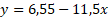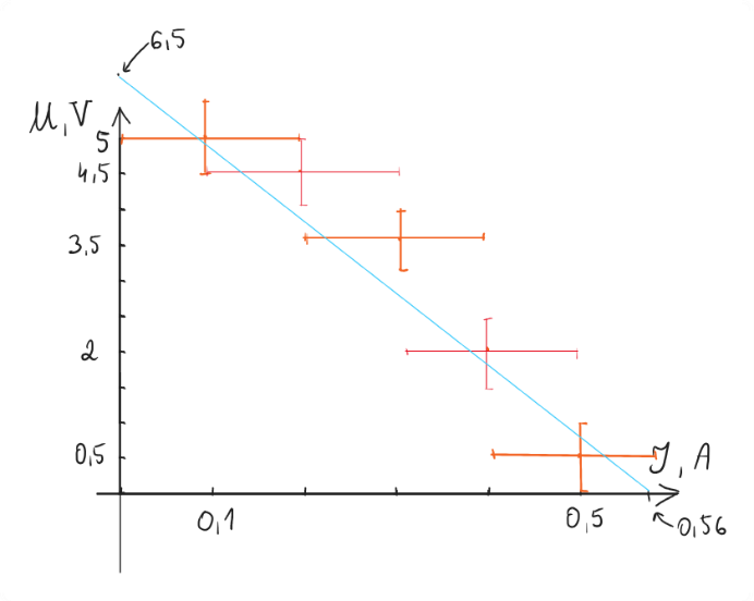 Porównujemy z naszym równaniem U(I) = SEM -Ir i uzyskujemy szukane wartości: SEM = 6,5 V oraz r = 11,5 Ω. Teraz można wygodnie narysować dopasowaną prostą. Mamy idealnie dwa punkty, które jednoznacznie określają prostą: (0; SEM) i (SEM/r; 0). W naszym przypadku wynoszą one odpowiednio: (0; 6,5) i (0,56; 0).