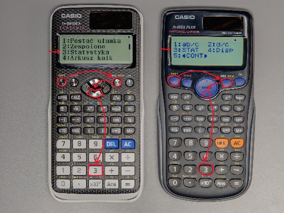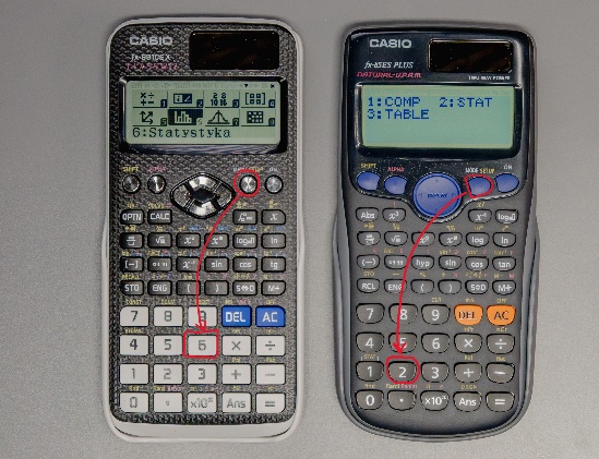 Po wyborze jednej zmiennej pojawia się pusta tabela za zmienną x. Wprowadzamy dane i każdą nową wartość zatwierdzamy =. Po zakończeniu wprowadzania wciskamy AC i następnie, w zależności od modelu kalkulatora, sekwencję przycisków, które wyświetlą nam szukane wartości. W starszym modelu będzie to SHIFT i przycisk STAT (nad 1-ką), natomiast w nowszym OPTN.